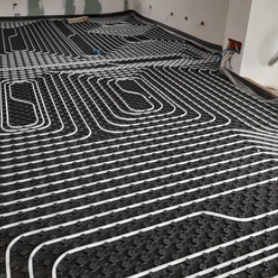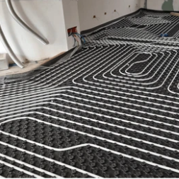 Tuberías de polietileno reticulado (PEX-a) de 16 mm, colocadas sobre panel aislante con tetones para garantizar una correcta fijación y un reparto homogéneo del calor.